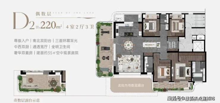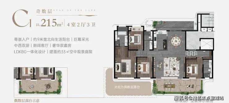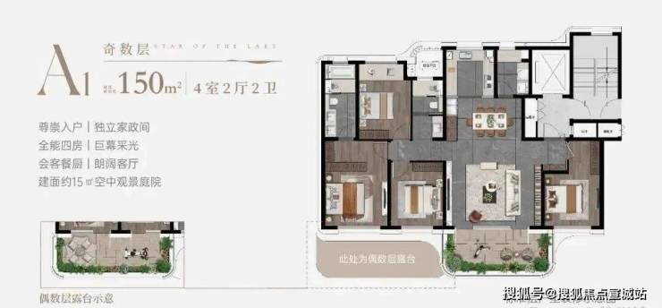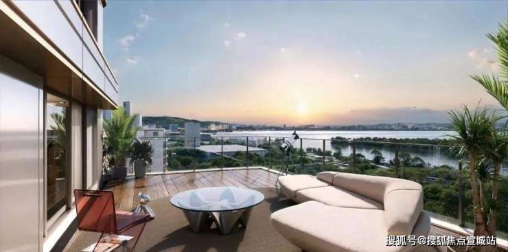 "一方云端庭院,让院落情结与现代技艺完美融合——约15-35㎡太湖空中院落,270°环幕揽湖光,6米挑高引清风,既是瑜伽观星的诗意栖居,亦是烧烤派对的社交主场,重构峯层生活的精神容器。"