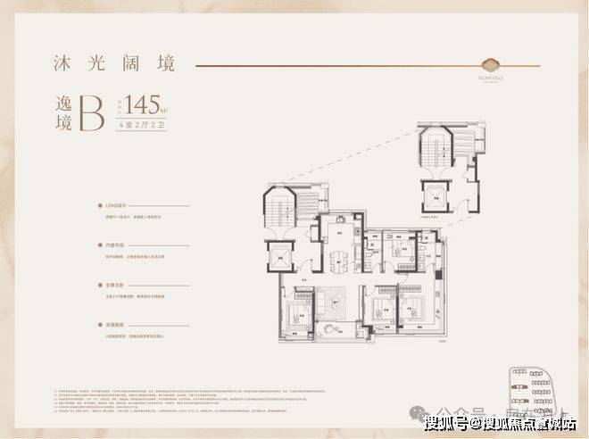 绿城逸庐售楼处电话400-885-1337户型特 点:4开 间朝南,LDK一体化设计,南北通透。客厅面宽达4.3米,外接4.8米长阳台,采光通风俱佳。主卧带270°转角飘窗,主卫也有飘窗赠送。全屋飘窗设计,独立电梯厅,私密性与尊享感强。