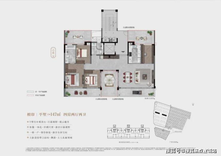 ③建面约147㎡平墅,4房2厅2卫:一梯一户;南侧T型超大景观阳台+北侧双露台;套房主卧,步入式衣帽间