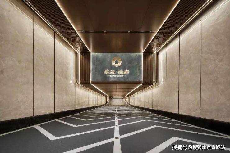 出入口通道顶部采用铜钱纹铝板吊顶,配合内嵌线型灯带,仪式感直接拉满。坡道两侧由仿石材板及不锈钢细节点缀,凸显设计感和立体感,顶部镶嵌家徽专属LOGO,形成归家崇高礼仪。