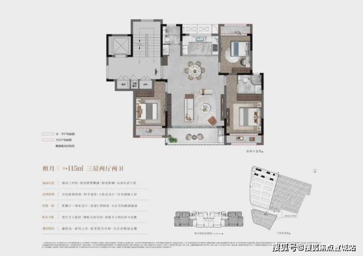 ①建面约115㎡洋房,3房2厅2卫:餐厨客厅LDKB一体化设计;三开间朝南,主卧套房;卧室均带飘窗。