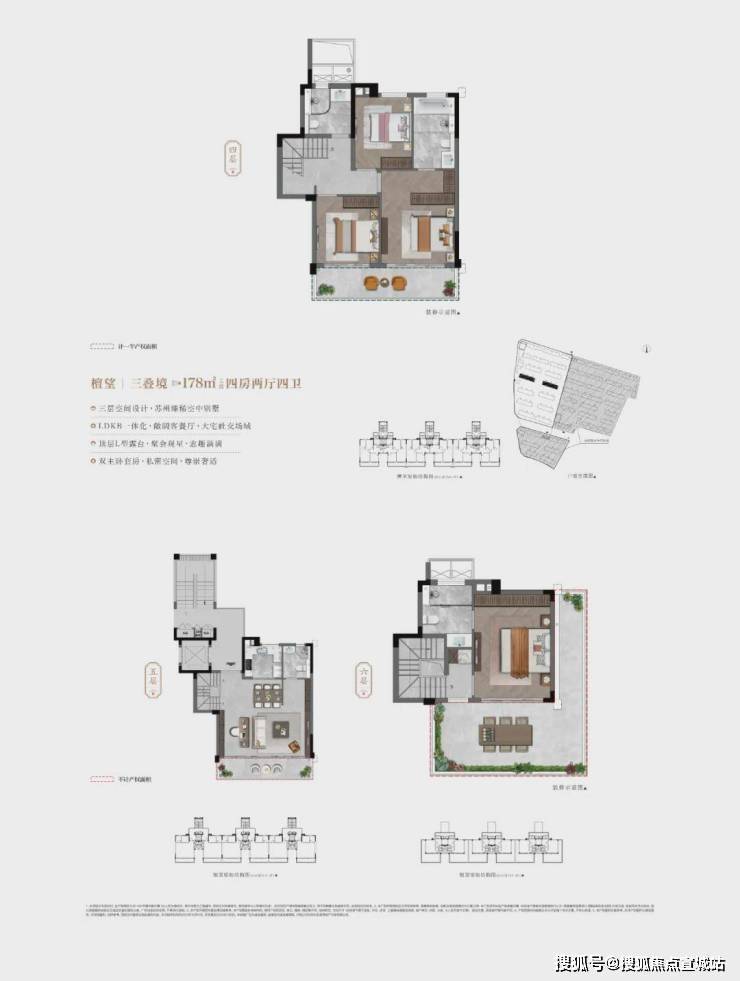 ⑧建面约178㎡叠墅,4房2厅4卫:整个户型南向采光面非常大,三层动静分离,南向双套房。顶层奢阔主卧,带超大L型露台。