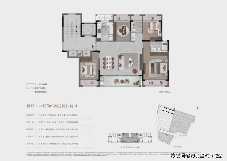 ②建面约125㎡洋房,4房2厅2卫:大横厅设计,外接双联阳台;四开间朝南,客厅北侧设置书房;