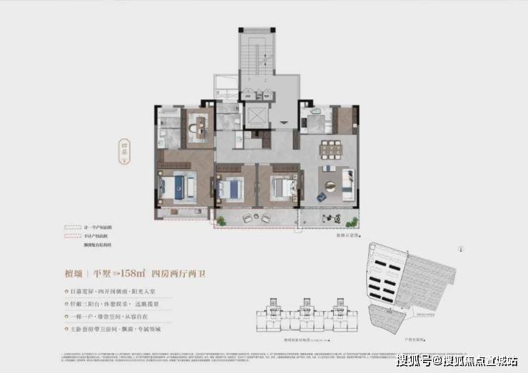 ④建面约158㎡平墅,4房2厅2卫:一梯一户,动静分区。南向3房,均带飘窗。北房间少承重墙,可改造为豪华主卧,南侧观景阳台+北侧双露台。