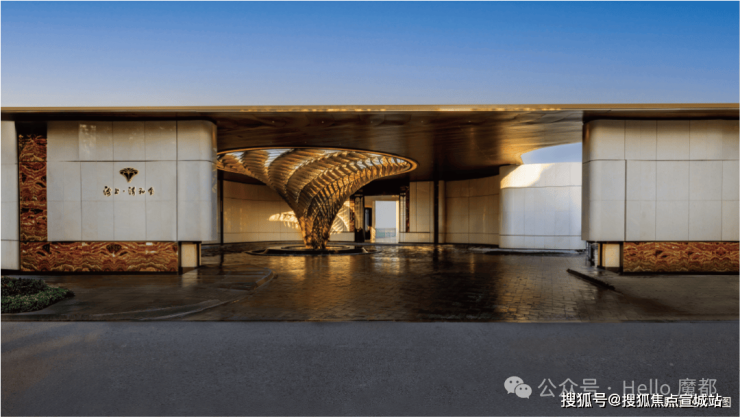 考究《周礼·考工记》古代规格定制“面阔九间”归家门庭,门庭外立面采用雅奢温润的建筑材料,辅以两侧具有仪式感的跳泉水景,共同构成了“贵雅清和”的城市界面。