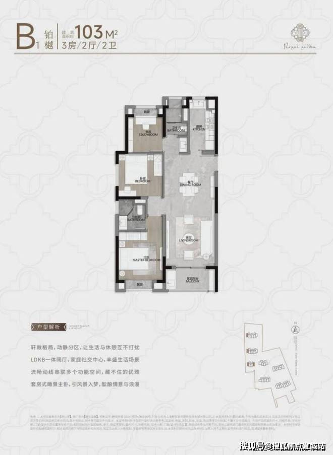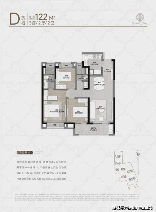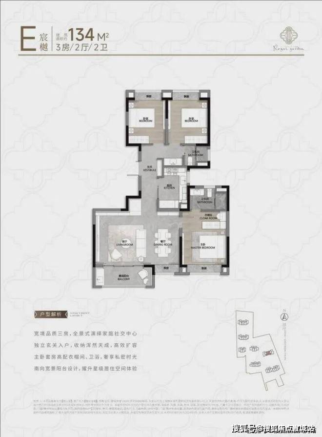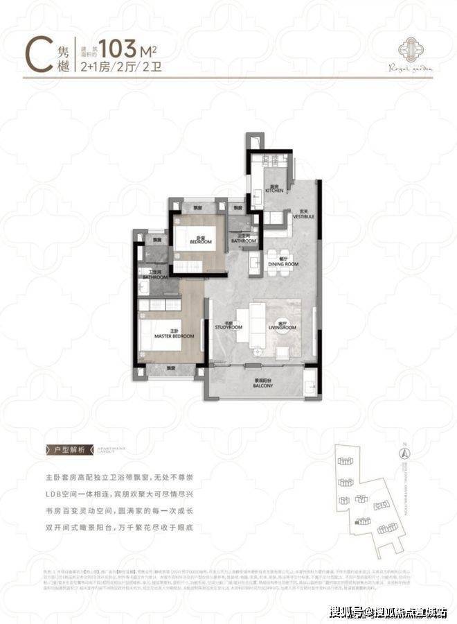 静安玺樾售楼处电话:400-8123-224(售楼处最新电话)上海静安玺樾官方电话:400-8123-224✔(官方售楼处预约看房热线)104㎡3户型特点:该户型多为楼栋的东边套,是一个观景户型.客厅连接270°阳台,视野出众.双卧朝南,阳光满溢.从次卫布局看,如果家庭人口较少,该户型还能做成双套卧.