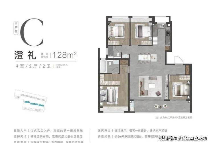 128㎡四房两厅两卫:四开间朝南加横厅设计,南向总面宽达 13.2 米,客厅面宽 5 米,与餐厅形成一体化通透空间,搭配全景落地窗。主卧套房面积超 25㎡,配备双台盆卫浴与 L 型衣帽间,厨房采用中西厨结合设计。