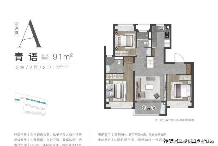 91㎡三房两厅一卫:三开间朝南,南向总面宽达 9.8 米,客厅面宽 3.6 米,搭配 3.6 米面宽的南向景观阳台。主卧配备 270° 观景飘窗,厨房采用 L 型布局,卫生间干湿分离。