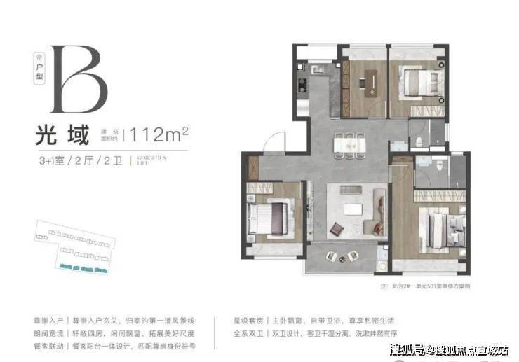 112㎡三房两厅两卫:四开间朝南,南向总面宽达 12.5 米,客厅面宽 4.2 米,搭配 6.8 米贯通式双阳台。主卧为套房设计,套内面积超 20㎡,配备独立卫浴与步入式衣帽间,厨房升级为 U 型布局。