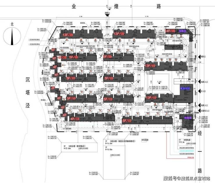 根据设计方案显示,项目拟建4幢总高13F的小高层,10幢2-5F别墅以及相关的配套建筑。