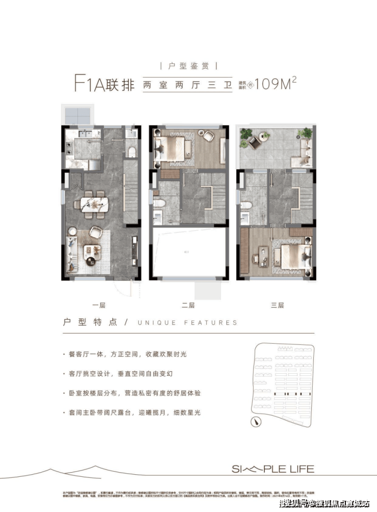 户型:在售建面约 106-109㎡联排别墅,一层客餐厅一体化设计,客厅开间约 4.7 米,二层北向设有次卧,三层为南向大套间主卧,部分户型带有地下室。