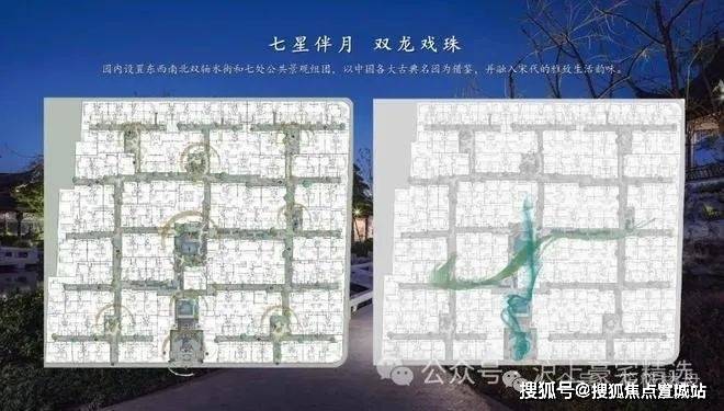 园内布局五进制南北主轴、以及“双龙戏水”格局的双水街,巷道联通,设七大景观组团,形成“一环、两轴、七境”布局。175席中式园宅,依巷分布南北,横平竖直,秩序井然。