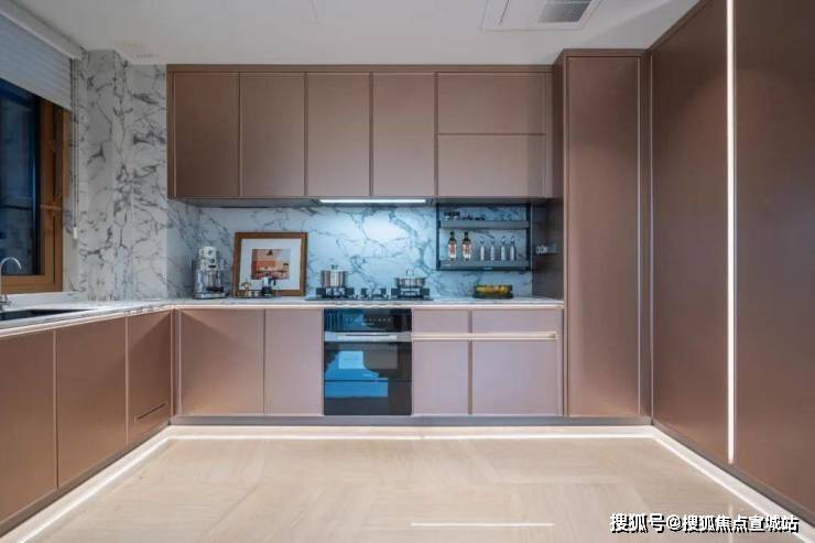 厨房橱柜内配置电动垂直升降调味篮、轻松抽、飞碟抽、木质折叠电动上翻门、旋转锅架等,全系配置高端五金件,轻松收纳取物,让厨房井井有条。