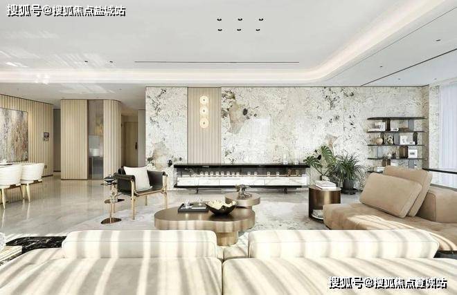 东区建面约320户型,将艺术感进一步融入日常中。特别设计的专属门厅空间,是从电梯厅延伸到家,如同一处艺廊,放慢人的情绪;室内选用了浅金色奢石(外界也称其为“芬迪白大理石”)作为主要的石材,曲面的木饰面也为浅色,整体给人以明亮感。