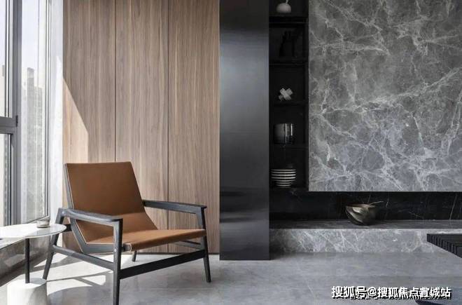 阳台处用黑色极窄门框做了低调的收口工作,亮面材质充当了两处空间之中很好的过渡。