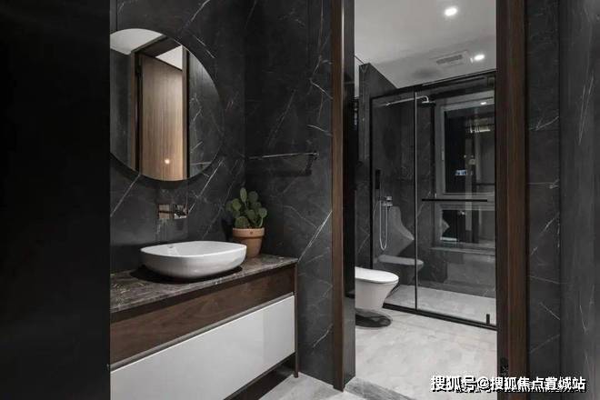 次卫将洗手区外置,内部功能分化同样做干湿分离的设计,黑色的岩板瓷砖彰显品位。