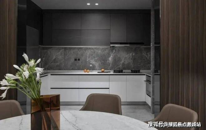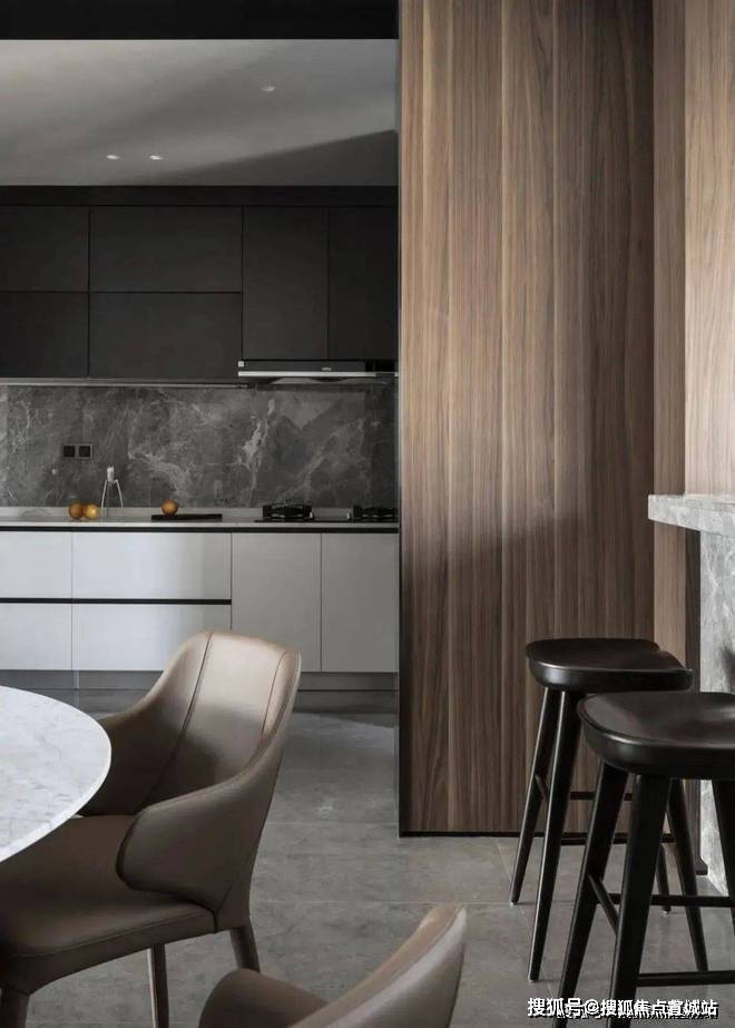 往里走是开阔的客餐厨空间,一面以冷静的灰色为主,另一面则以温润的木色装饰,诠释了居室的多样性。