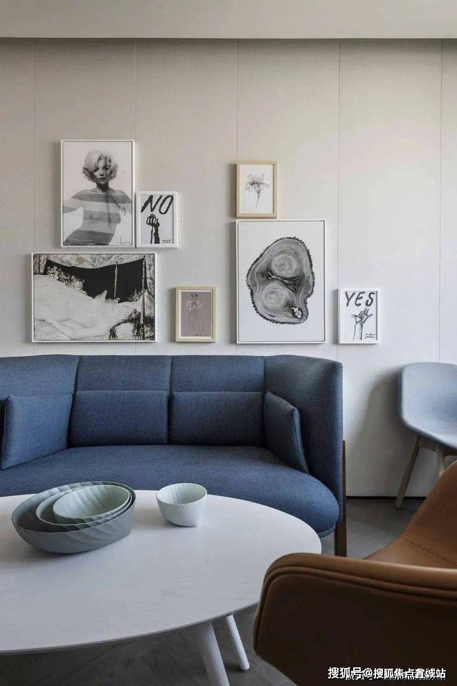 客厅的背景墙选用的是灰色布纹的装配面板,搭配异形造型的装饰画,个性十足。