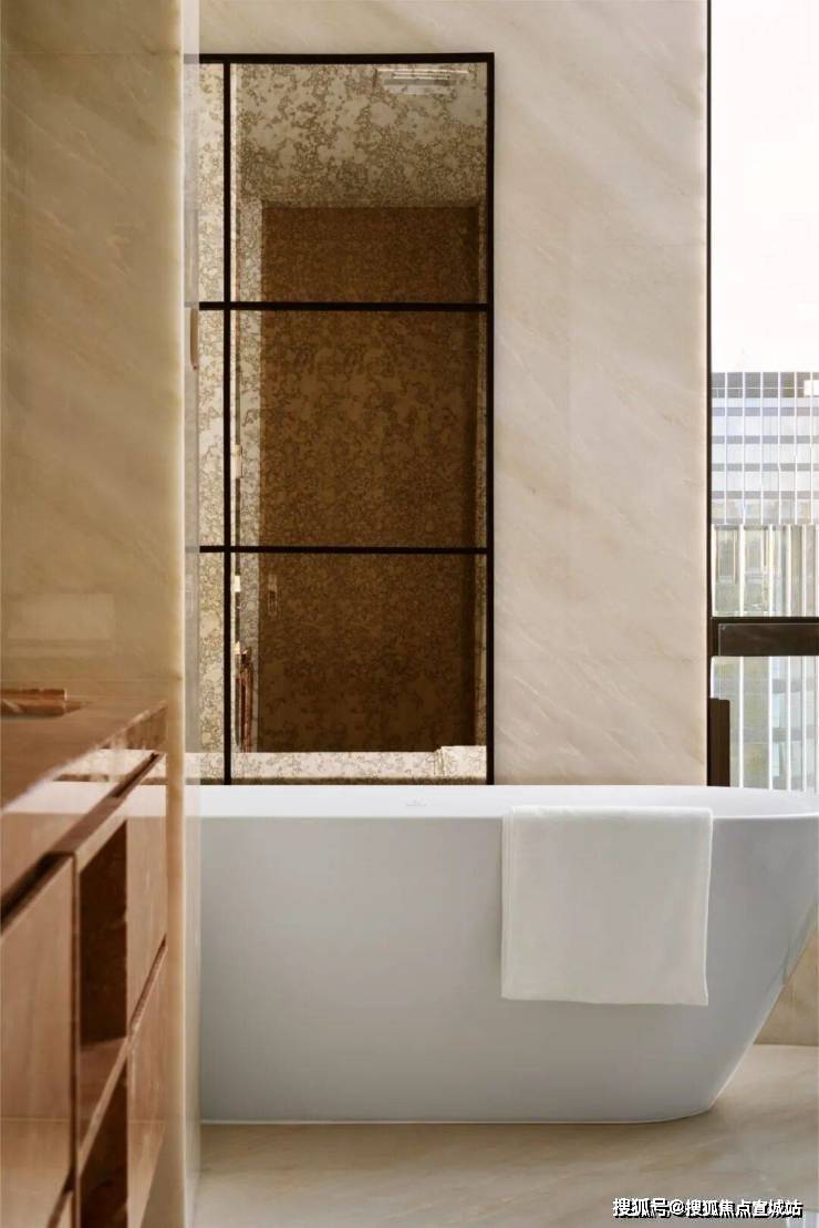 底部以石材和金属结合的曲线异形巨柱抬高建筑体量,构筑了廊柱与动态景观空间,既满足了尊贵的入户大堂需求,又释放了底层空间的潜力,进一步提升了低层住宅的采光效果和视野范围,从而营造出更为宜人的居住环境。