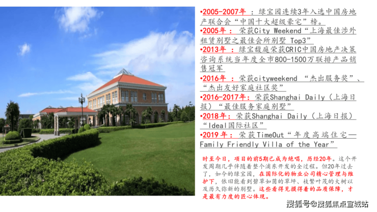绿宝园别墅位于南汇康桥开发区,奠基开工于1999年,占地近40万平方米,迄今共推出5期产品及“绿宝.馥庭”,经过多年的开发已成为上海成熟高档的别墅社区之一,曾连续三年被评为“亚洲十大豪宅”,其多年来以纯正的美式规划,美式物管等西方的概念和执行。项目从规划之初即定位于打造具有北美风格、以外籍客户为主的涉外高档社区,在知名规划与设计团队的主导下,致力于高标准的设计、高品质的建筑、经验丰富的管理团队为住户提供全新的生活标准。