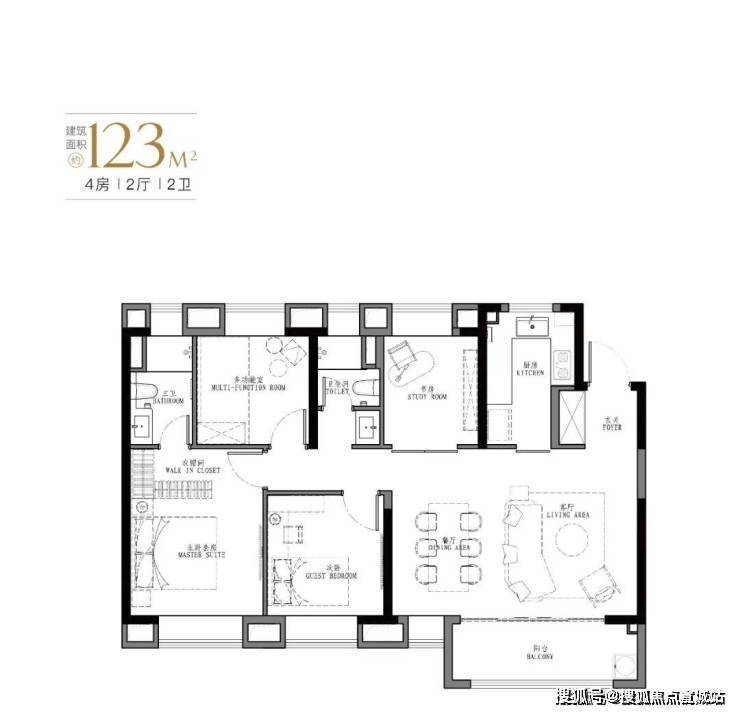 产品:103㎡、107㎡的三房两厅两卫及123㎡、129㎡的四房两厅两卫