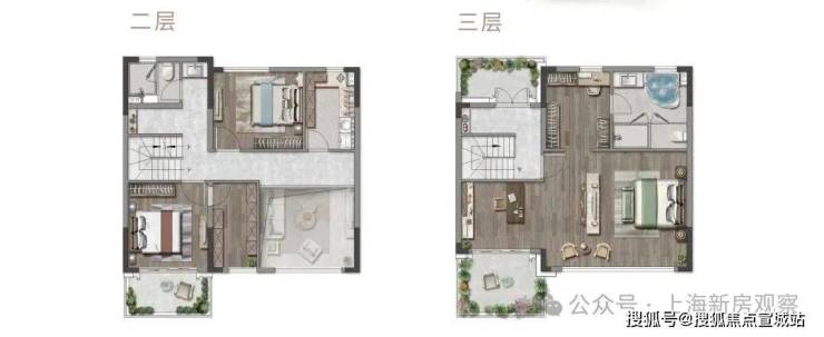 三层可以说是更为震撼的,这一层是专属于主人的天地。整体宽敞明亮,步入式衣帽间、中央圆形浴缸布置如酒店般舒适精致,独立起居室给生活倍添仪式感。