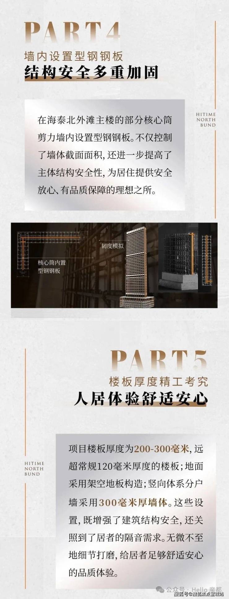 在结构安全方面,海泰充分吸取国内外经验,结合所处城市以及地块的地质条件,进行充分论证,对地基和基础、梁、板、柱等关键部件的设计与施工,都进行了更多安全方面的专业考量。比如,设计了框架体系、核心筒体系和安全屋等多道抗震设防体系,主楼采用直径800毫米桩长60米的钻孔灌注桩,间距2400毫米,呈梅花形布置,桩端采用后注浆技术,进一步提高桩身承载力;主楼结构柱采用圆角钢骨劲性柱,户内结构柱均做倒角工艺,安全与美观兼具。此外,海泰还在主楼的部分核心筒剪力墙内设置了型钢钢板,控制墙体截面面积;200-300mm的楼板厚度,远超常规120mm厚度的楼板,既安全又隔音。