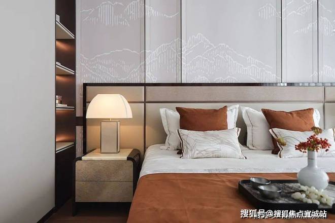售楼处电话:400/8862/334【热线】主卧室延续了客餐厅的雅奢韵味,床背景采用细腻的艺术壁纸,展现出一幅中式山景。软装上,将东方特有的符号融入家具、灯具等的细节,床则采用了宽靠背具有中式线条感的特别设计,大气又兼具东方特色。艺术品的陈设上也与客餐厅遥相呼应,运用山景的静谧,营造出卧室的悠然自得。