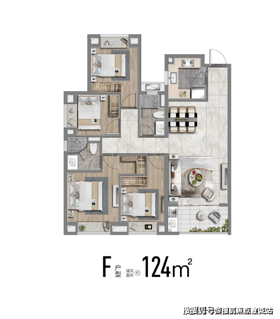 建面约124m²四房,市面常见的四房普遍要135平,这个约124平米户型功能性拉满,且控制了总价,给予更多小伙伴一步到位的机会.