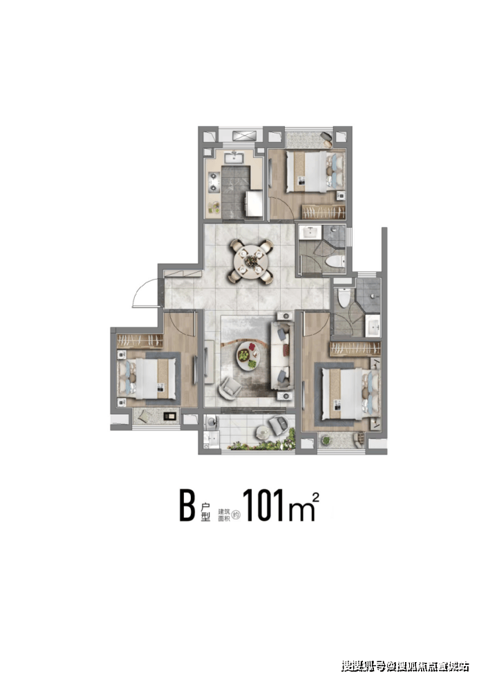 也有建面约113m²舒适性三房,南北通透;飞机户型,房间分列两侧互不打扰;卧室空间也相对更大、更舒适.