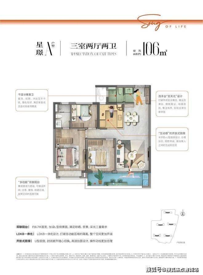 崇璟和颂府售楼处营销中心:400-8828-814崇璟和颂府售楼处电话/地址☎:400-882-8814(开发商热线)约106㎡户型点评:双联阳台约6.7米面宽,加设L型俯景面,满足晾晒、赏景、采光三重需求,LDKB一体化设计,打破各功能区域的隔离,整个空间更加开阔,开放式厨房 U型厨房,封闭敞开随心切换,高效台面设计,操作动线更加合理