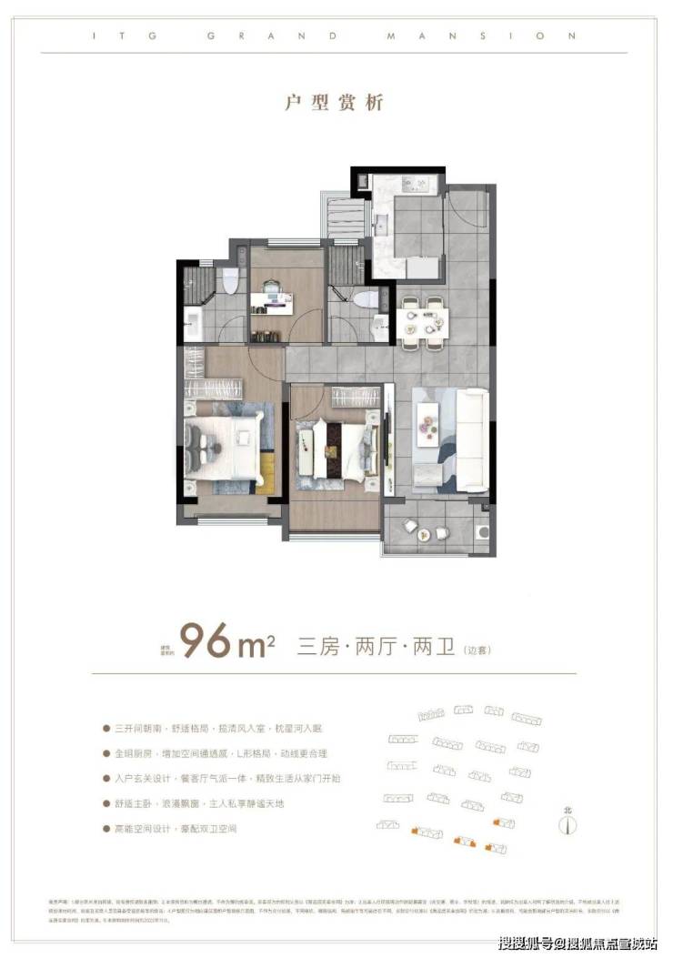 户型方面: 约85-96㎡的全三房设计,每一款户型都是会传递出国贸的产品观。南北通透,布局考究,动静分离。