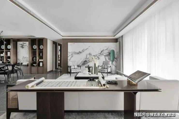 书房空间被设置在了客厅的后方,二者并没有明确的界限和分隔,仅以沙发进行隔断。让空间更显宋式美学的清幽之感。
