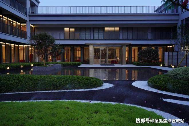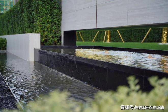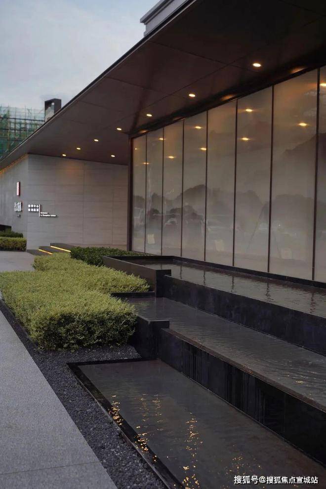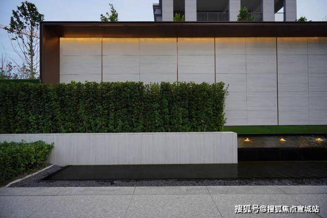 规则的绿植、层叠的水景营造入口空间体块感的同时也消除了门廊和围墙的生硬感,结合灯光、小品,为空间注入一抹灵动与温暖。