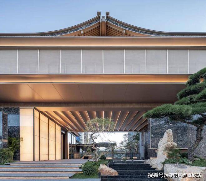 立面设计以“现代形制,东方意境”为笔法。合院立面汲取传统“平座上建屋”的形制逻辑,以深色石材基座构筑沉稳体量;浅色石材作载体转译格子门与横披窗的构成逻辑。细部处理上,将东方建筑符号转化为现代建筑语言:歇山顶山花处的悬鱼构件成为空中的雅致点缀;转角嵌饰回形纹椽头,将结构之美凝练为精致符号;雕花格栅源自宋代传统门窗的四抹头隔扇,以其通透特质引光入画,赋予建筑随时间流转的光影表情。叠墅立面则采用斜边框挑檐造型与舒展的水平线条,塑造出轻盈优雅的建筑形态,与东沙湖宁静开阔的景致相呼应。