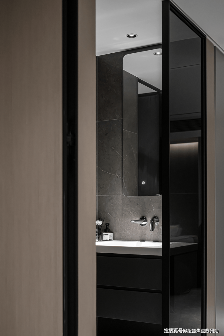 独立的盥洗室采用了哑光黑的设施和大理石的墙壁,凸显出一种奢华高雅的氛围。