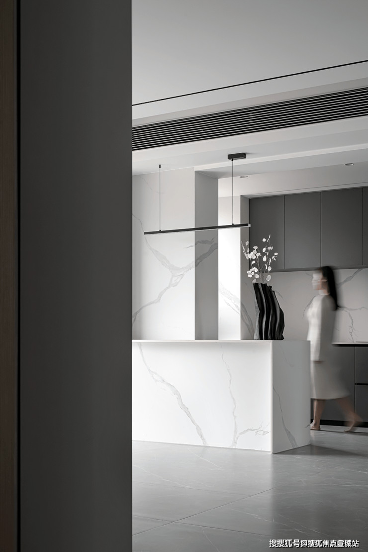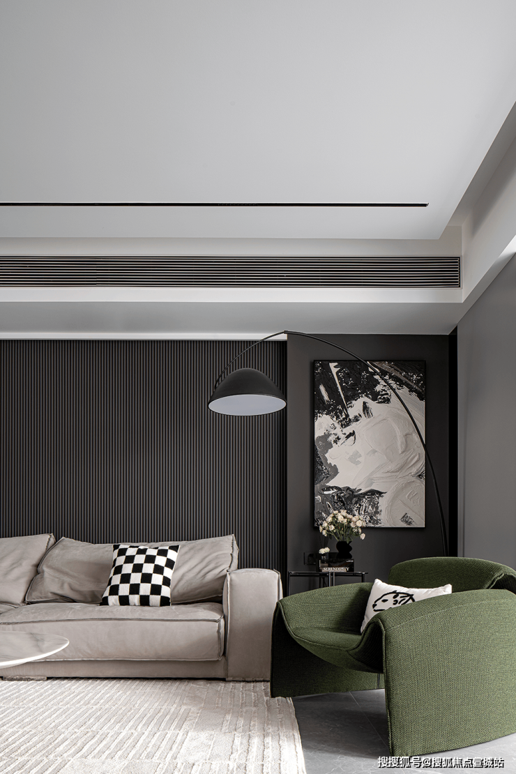 双层吊顶设计,巧妙地赋予了空间更丰富的层次感。客厅沙发的背景墙采用灰色硬包材料,点缀金属线条,简约中透露着大气与优雅。