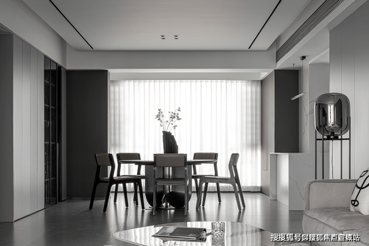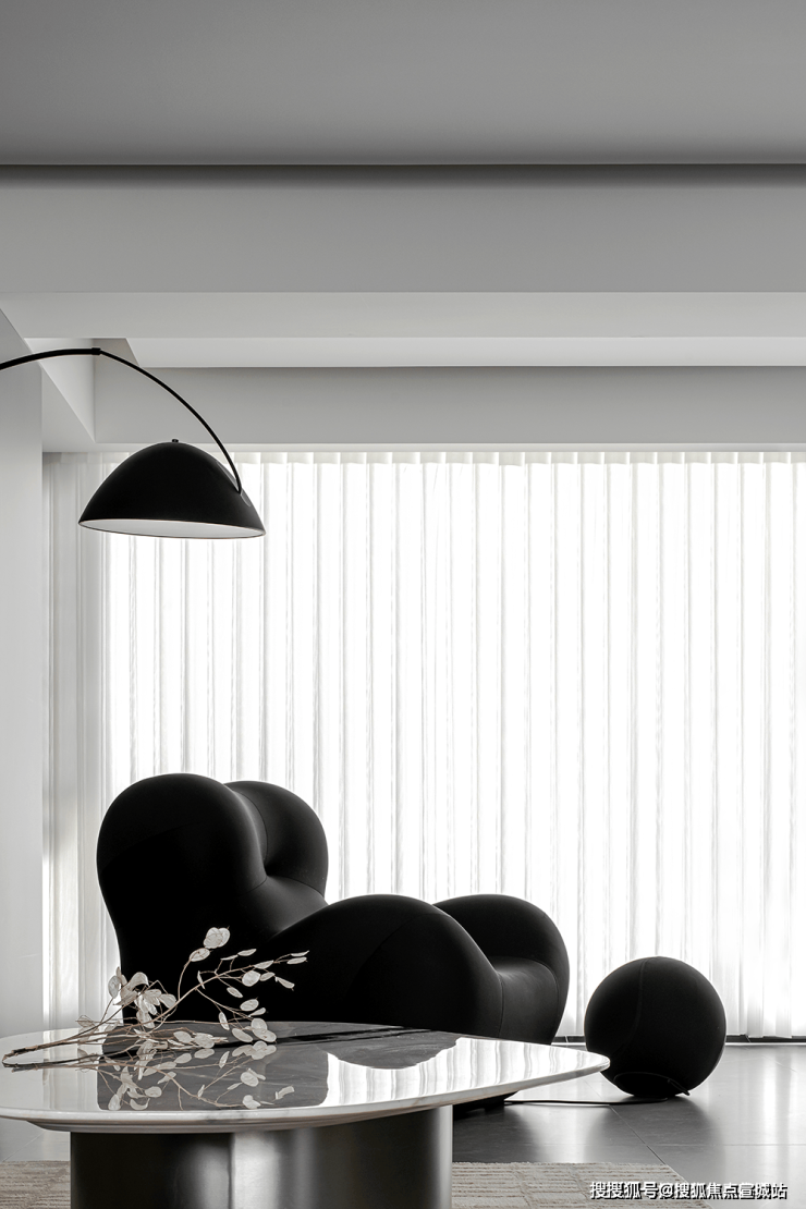 设计中贯穿的开放式布局,抛却了传统封闭的束缚,使各功能区自然而然地相互融合。黑色的异形沙发如一曲动感的旋律,注入了空间活力,其多处凸起的设计,更是贴合身体曲线,为居者带来舒适无比的体验。