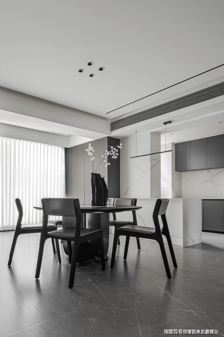餐厅与厨房的融合呈现出一种和谐的氛围,采用内嵌式的储物柜和开放式的厨房设计,使整个空间流畅自然,宽敞明亮。在用餐时,透过落地窗,尽情沉醉于窗外的美景之中,仿佛是与自然对话的一种享受。
