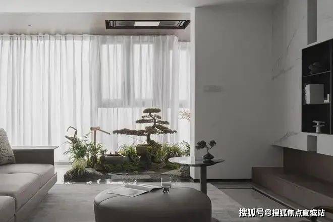 超大落地窗旁加上业主喜爱的自然元素,做好防水即使活水也不怕。水声窸窸窣窣,当阳光洒下来,波光粼粼。绿植黄叶,沙中板砾,宛如缩小版林间小路,在室内也依然可以生机勃勃。