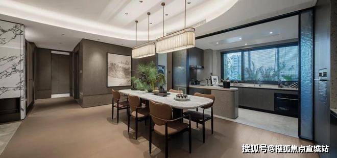 澜庭·雅致开放式空间格局,宽绰尺度之余,以简洁线条勾勒餐客厅层次纵深,打破隔绝与拘束,作为兼容高端社交需求的家庭欢聚场,让交流、互动、体验交织其中,奢享家庭情景化生活美学。