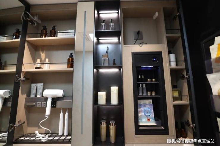 整面墙的镜柜,内部配备了 美妆冰箱+门板收纳架+轨道式置物架 ,储物空间打造的非常充足。