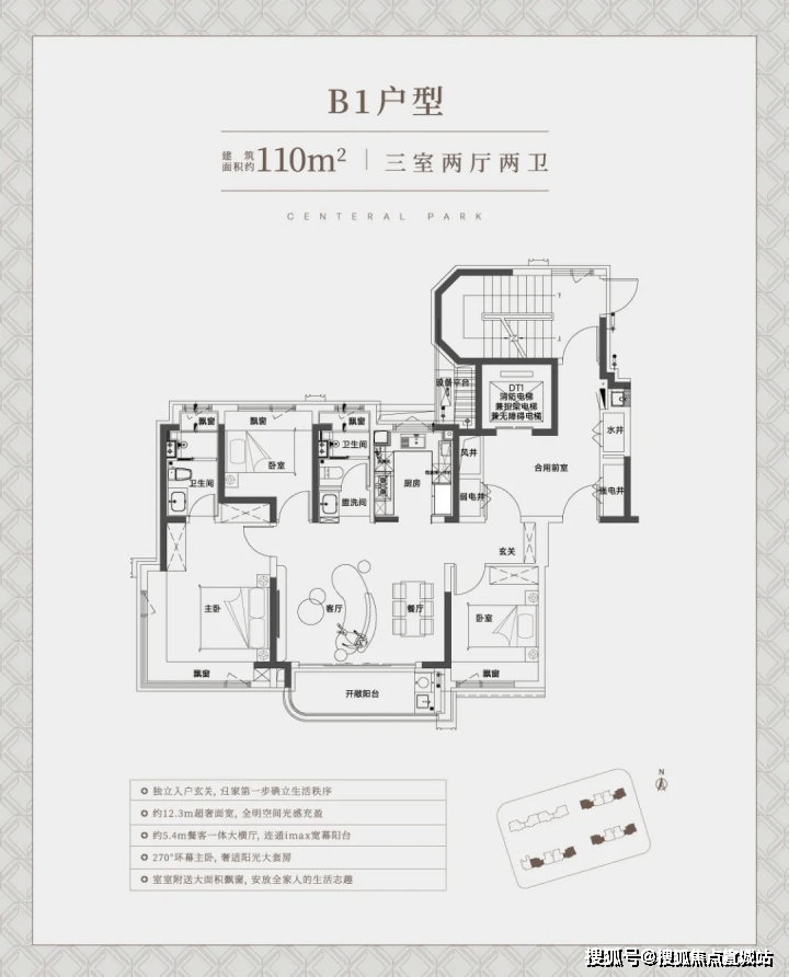 建面约110㎡三房边套户型,约5.4m超大横厅、南向面宽做到了惊人的约12.3米, 堪比别墅级别的产品!巨幕阳台+边套270°景观视野,空间体验与采光感拉满!