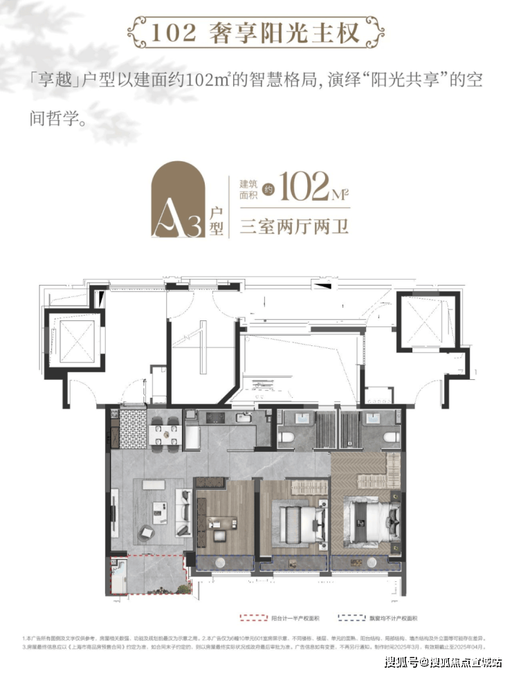 建面约103㎡3房户型:比起市面上普遍的三开间朝南动静分区户型,建发·海阅首府该户型至少有3大爆点: