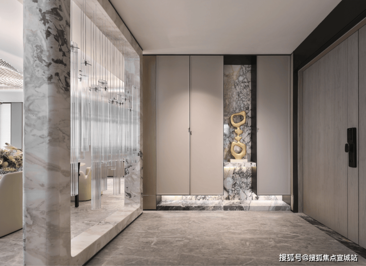 东区建面约320户型,将艺术感进一步融入日常中。特别设计的专属门厅空间,是从电梯厅延伸到家,如同一处艺廊,放慢人的情绪;室内选用了浅金色奢石(外界也称其为“芬迪白大理石”)作为主要的石材,曲面的木饰面也为浅色,整体给人以明亮感。