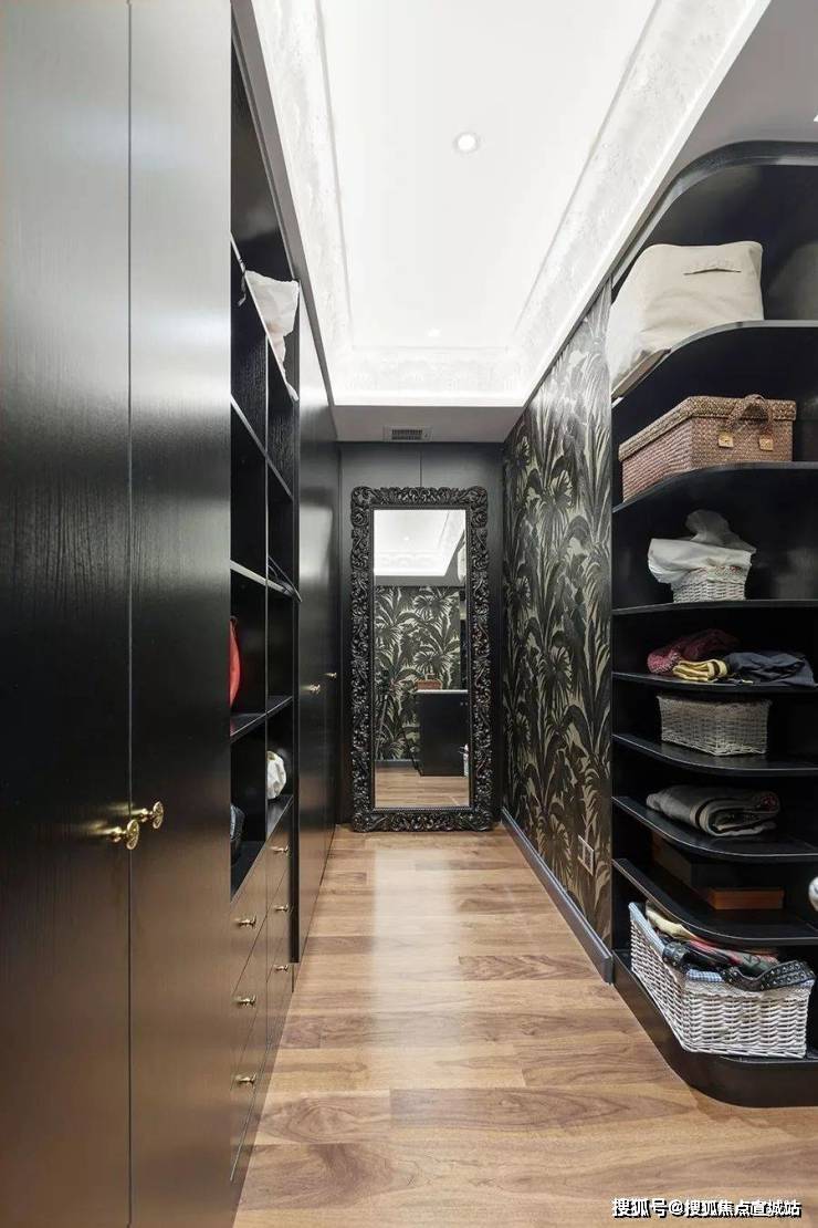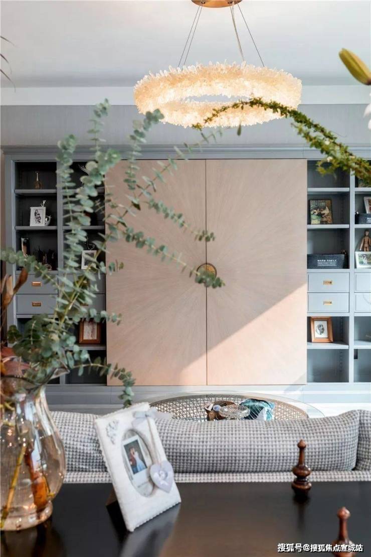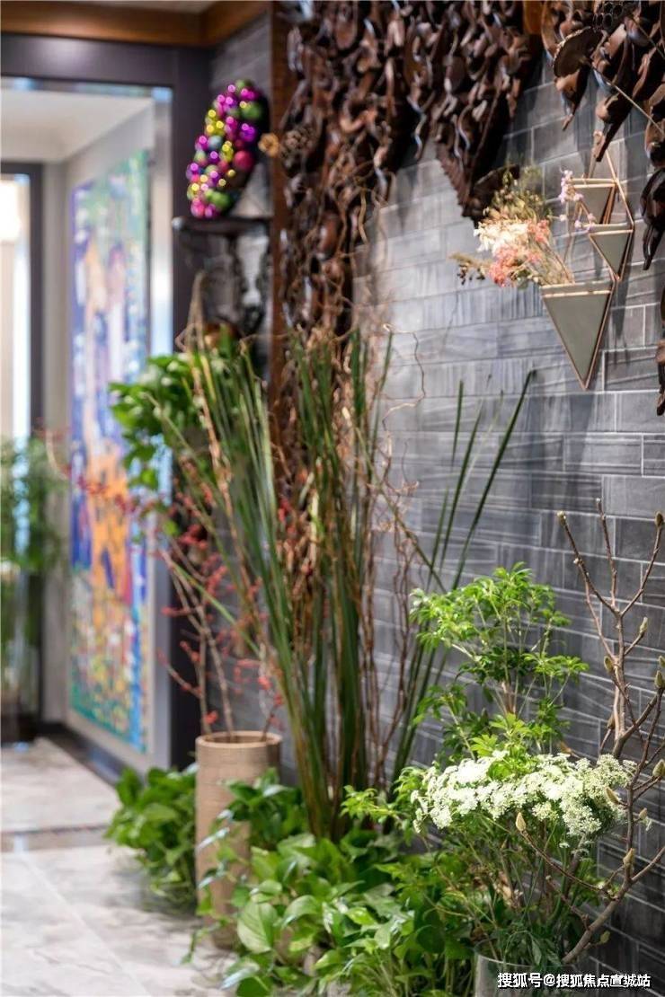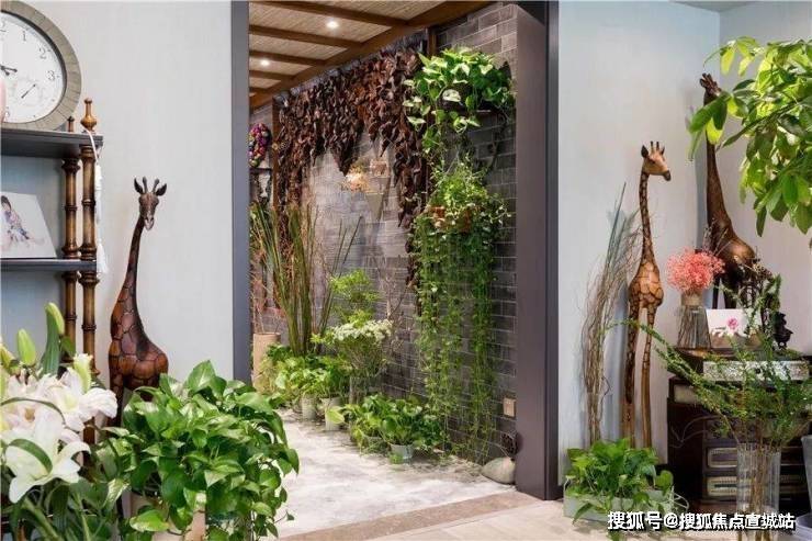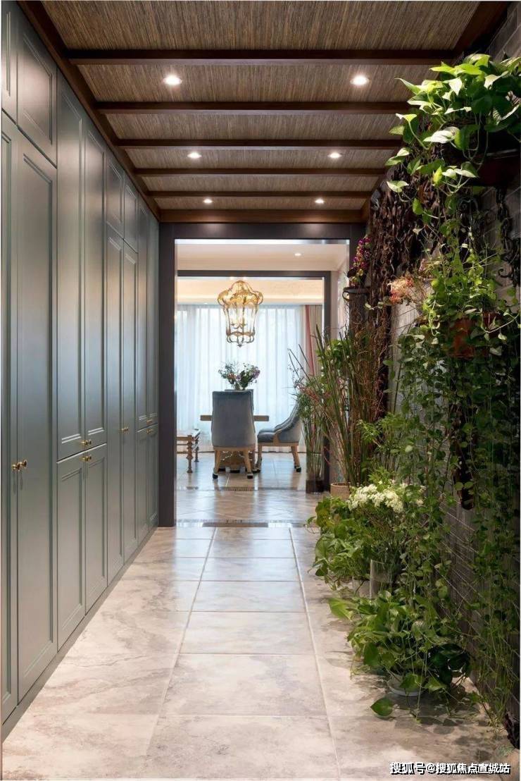 花廊借由原本的走廊打造而成,设计师在墙面设计了一些雕花装饰板和搁板架来摆放和吊挂植物,垂坠的吊兰、绿萝、常春藤等把整面墙装饰地如瀑布一样,观叶植物倾泻而来,带来极强的视觉冲击。晓晓在地下还摆放了整排的盆栽植物,雪柳、蒲棒、冬青、玉兰、蕾丝、芭蕉、鸭掌木、虎皮兰、茶花、仙人掌等,不定期会更换新鲜的花。