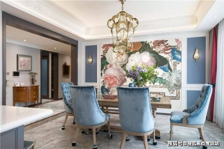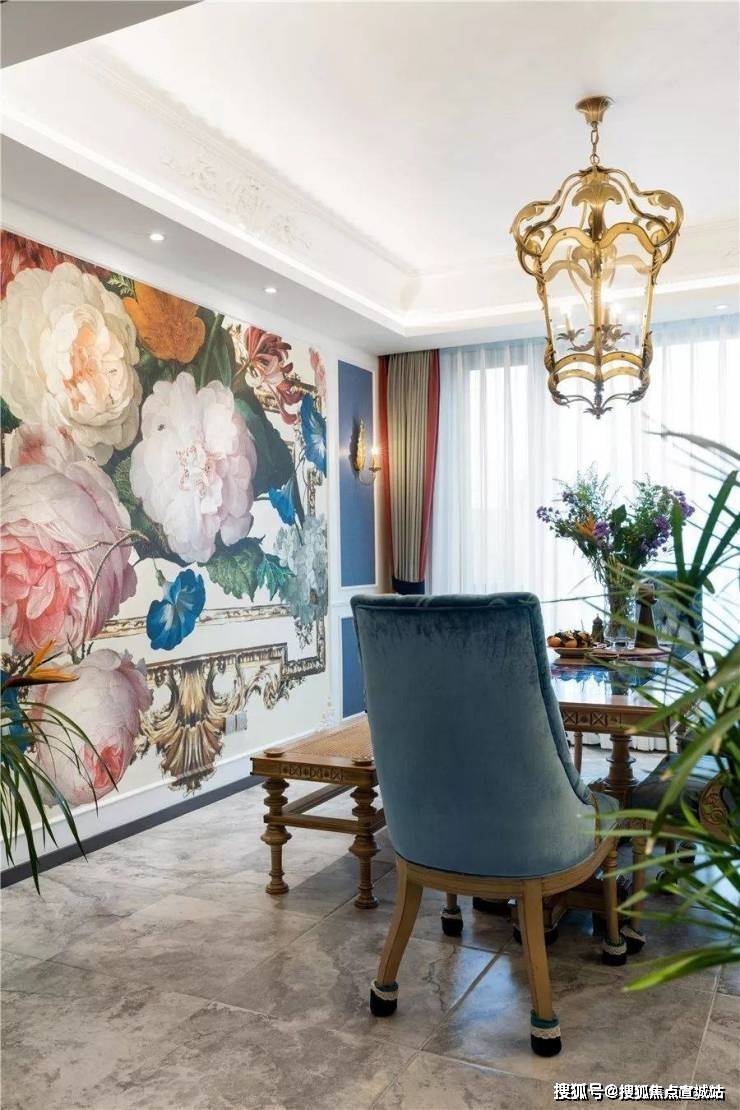 餐厅墙面呼之欲出的大朵大朵的牡丹和喇叭花,设计师画出了生动的立体感,好似下一刻就会从墙体里开出花来。
