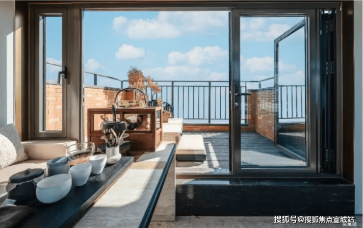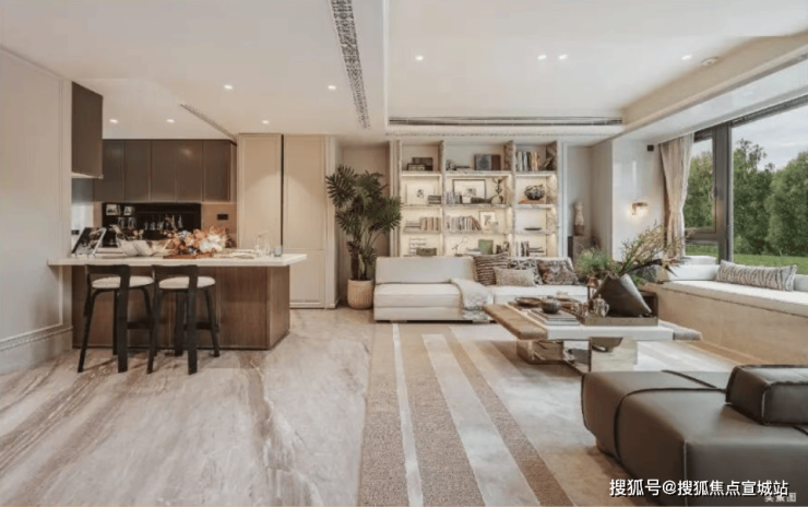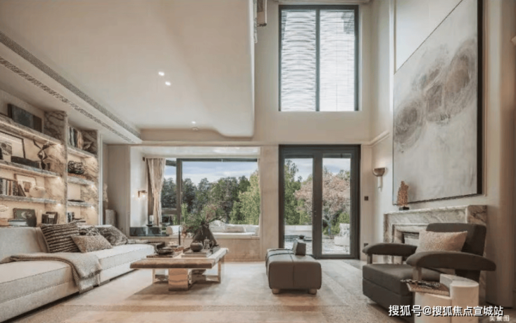 客餐厅、南向次卧、独立主卧层层配享同等尺度面宽,充分将全天日照最大限度地纳入室内。巨幅落地玻璃窗如同取景框,将庭院绿意无缝衔接入内,最大化确保了每位家庭成员都能平等地享有阳光与观景的权利。