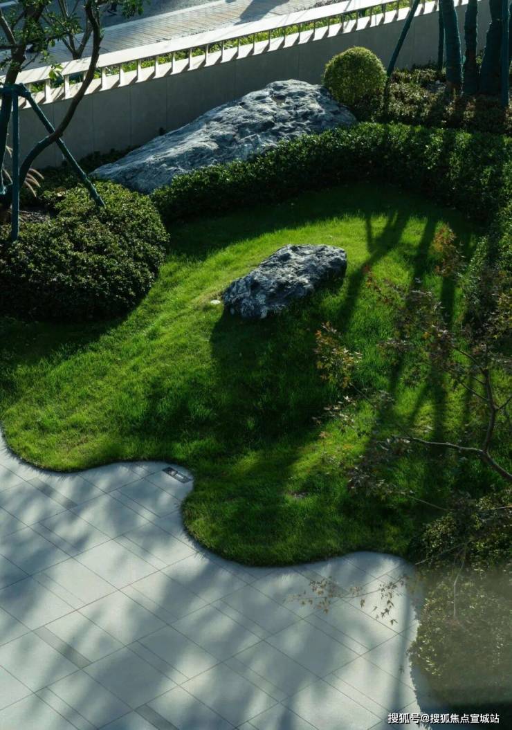 △曲线线条切割石材,设计灵感来源于水的波纹,用无垠的草坪呈现水景,置石为扁舟,别有一番意境。