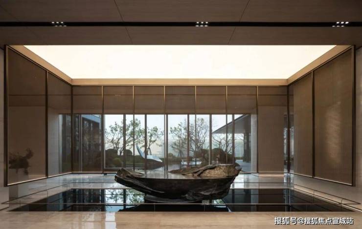 △暖色的硬朗金属碰撞花纹理石材形成长轴画卷,现代镜面水池刻画着精致氛围